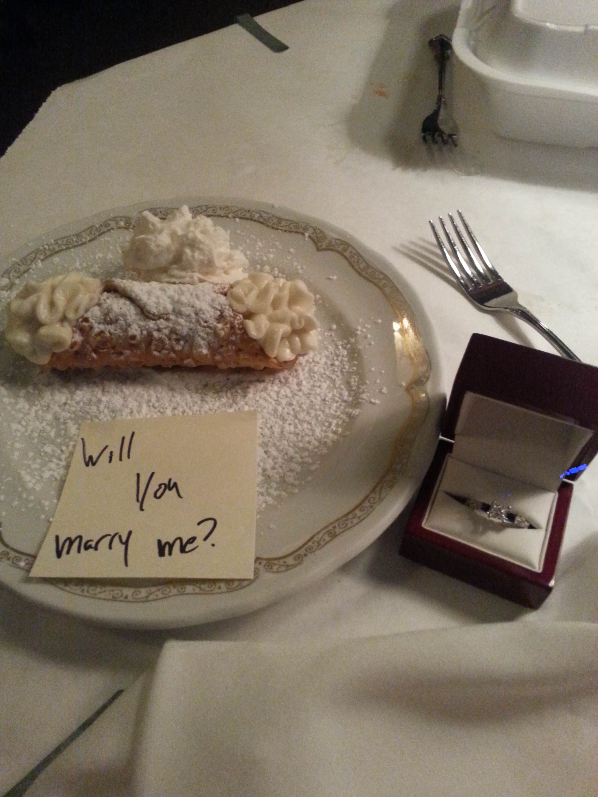 And waited. Until the waitress brought out a Cannoli, with a post-it note reading “Will you marry me?” BoySam got down on one knee, said a small speech neither of them can remember, and she said “yes!”